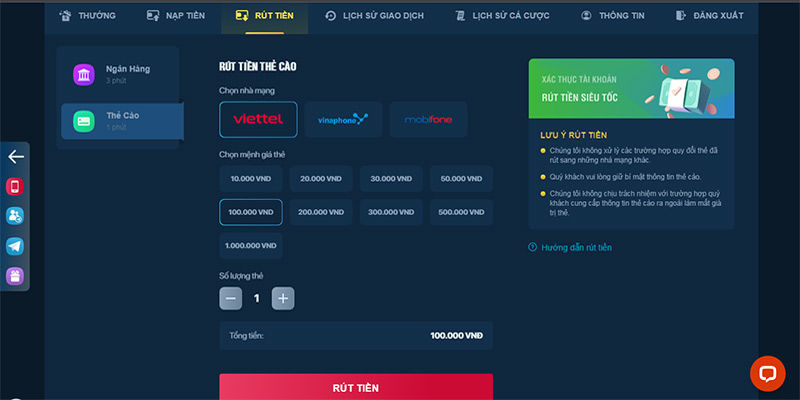 - Bước 3: Click vào ô “Rút tiền” để chờ nhà cái xét duyệt trả thưởng bằng mã số thẻ và số seri thẻ cào.